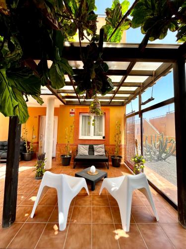 Una splendida villa di lusso situata all’interno dell’esclusivo complesso residenziale Mirador de Las Dunas, a soli 2 km dal centro di Corralejo, a 500 metri dai supermercati più rinomati e, soprattutto, al confine con lo straordinario Parque Natural de Corralejo.